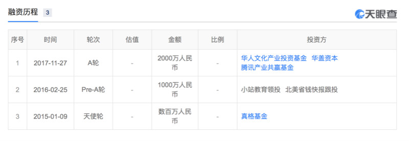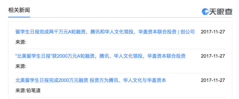 天眼查显示,2017年11月27号,留学生日报完成了A轮2000万人民币融资,投资方为腾讯产业共赢基金。其他轮次的投资机构有诸如,2015年1月的真格天使轮投资,2016年小站教育领投、北美省钱快报跟投的pre-a轮融资。