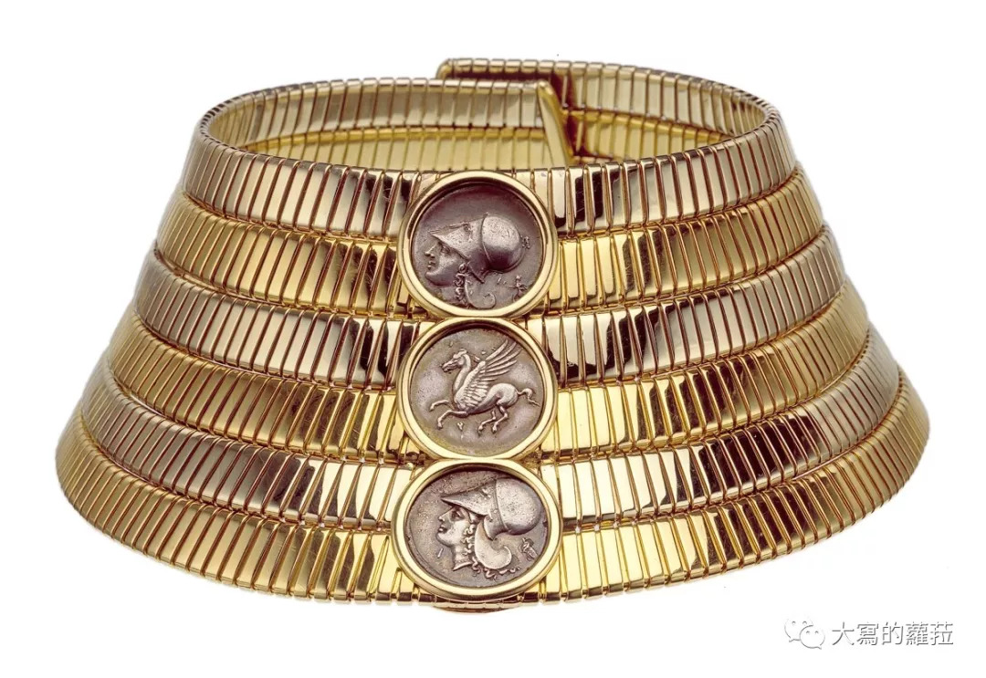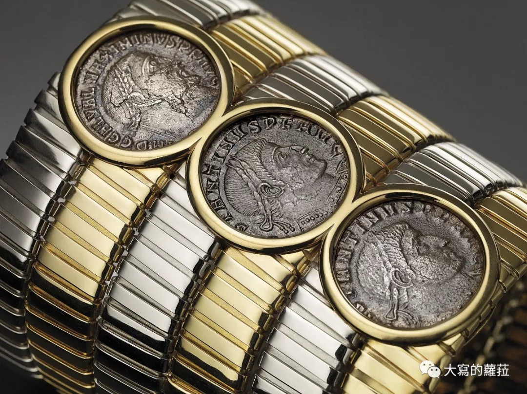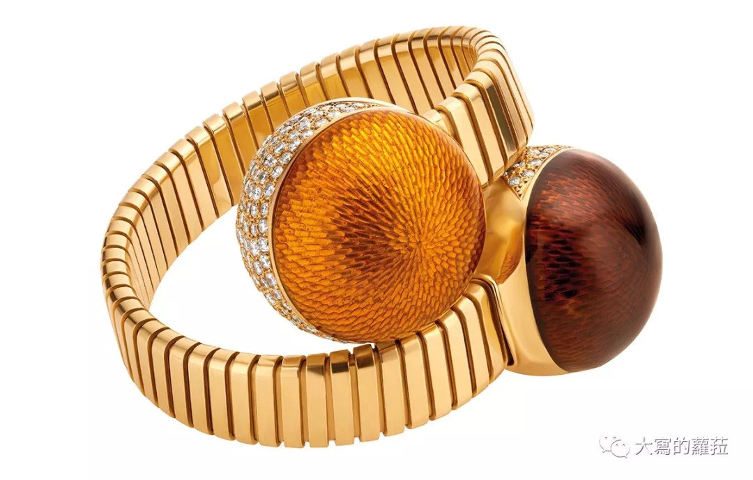 Tubogas因为其缠绕的环形外型,多半被使用在宝格丽的蛇形腕表上,珠宝作品也多出现在颈环链与古币或其他金工工艺搭配,在所有宝格丽虽然件数不多但却精彩无比的古董作品中,我最喜欢的是一款制作于1975年、搭配透明珐琅的Tubogas手环,在Tubogas手环的两个尾端装置上两颗大圆金球,金球表面使用机雕雕刻出闪电纹路再以透明橙色、棕色珐琅烧制,这种将金工工艺与传统装饰工艺,以一种前卫大胆却拥有特殊当代风格的设计,将宝格丽与众不同的风格与气度表露无遗。