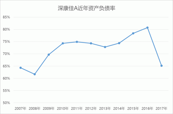 多年以来,康佳资产负债率高企。2010年至2015年资产负债率均在75%左右,在2016年达到峰值80.75%。这一数据在同行中处于较高水平,且康佳2015年和2016年的资产负债率为家电板块各公司之首。这并非一个有益的数字。2017年卖子获利后,公司的资产负债率回落至65.20%。但此路可一不可再。
