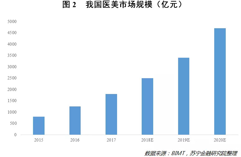 (1)医美类。“颜值经济”的兴起让医疗美容行业逐渐由极少数人群的专属向广大群众普及,并成为继房地产、汽车销售、旅游之后的第四大服务行业。据BIMT数据显示,我国医疗美容市场将于2020年达到4640亿,年均复合增长率达38.14%(参见图2)。而ISAPS(国际美容整形外科学会)的数据同样证实,我国已经成为仅次于美国和巴西的全球第三大医疗美容国家。