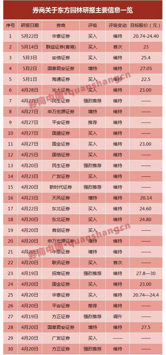 据券商中国记者不完全统计,4月份以来,至少有21家券商发布了30份针对东方园林的研报,16份给出了买入评级,6份给出了强烈推荐,最高股价区间27.8元-30元。
