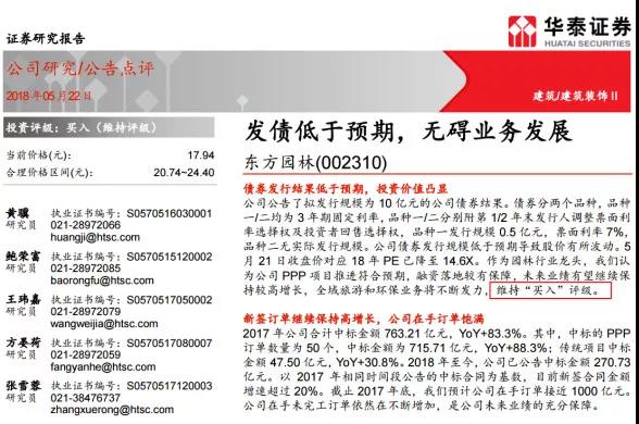 就在5月21日东方园林公告,债券发行结果低于预期之后,华泰证券依然发表研报力挺,“发债低于预期,无碍业务发展”。