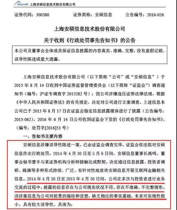 2015年A股第一高股价安硕信息,2016年6月14日公布了证监会处罚通知。