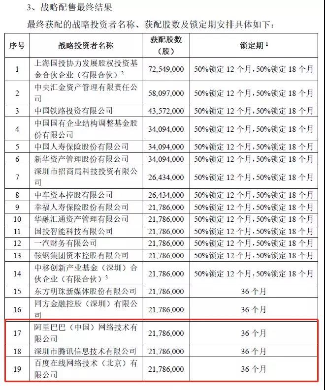 互联网巨头队自然是最一线的BAT。阿里、腾讯、百度均直接认购了2178.6万股,认购金额均为3亿元,合计9亿元。锁定期均为36个月。