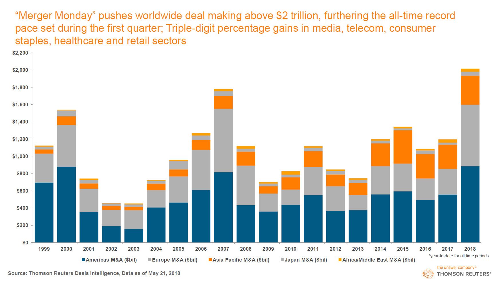 汤森路透在本周二公布的数据显示,迄今为止,全球并购交易金额(已披露)在2018年已经创下自1999年以来的年度新高。仅周一美国地区就宣布了约280亿美元的交易,涉及行业包括电力、金融和房地产。并购活动在全球范围内如火如荼上演。