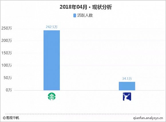 据易观千帆数据显示,2018年4月,星巴克中国APP活跃用户242.5万,而瑞幸luckin coffee目前仅有34.1万活跃用户。而且从趋势分析上我们也可以看到,瑞幸还处于早期生长阶段,而星巴克中国正在经历快速增长的阶段。