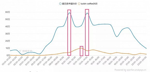 瑞幸咖啡、星巴克中国APP用户分时使用时段对比