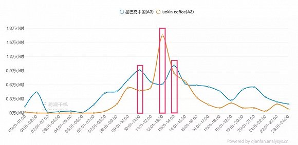 瑞幸咖啡、星巴克中国APP用户分时使用时长对比