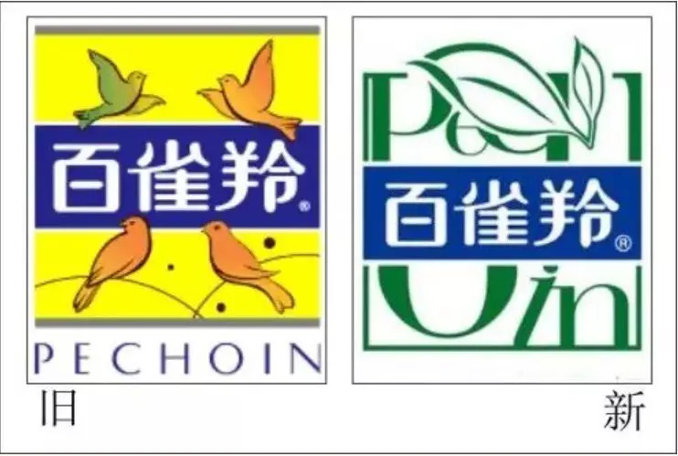 百雀羚转型第一步做的就是 logo 上的与时俱进。从原来的四只雀加英文的构成进行优化,绿色元素也更丰富,从而更加诠释品牌文化特征。
