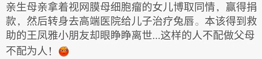 杨美芹带着孩子离开北京后,微博上的寻人启事沸腾起来:「寻找被妈妈弃疗的患有眼母细胞瘤的 2 岁女童王凤雅」。