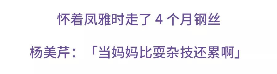 杨美芹一直还在杂技团工作,每个月工资一两千块钱,这过程中她生了三个孩子,直到 2014 年怀上王凤雅,凤雅在她的肚子里陪她走了 4 个月钢丝,肚子凸起,老板说杨美芹已经穿不了戏服才让她离开了杂技团。