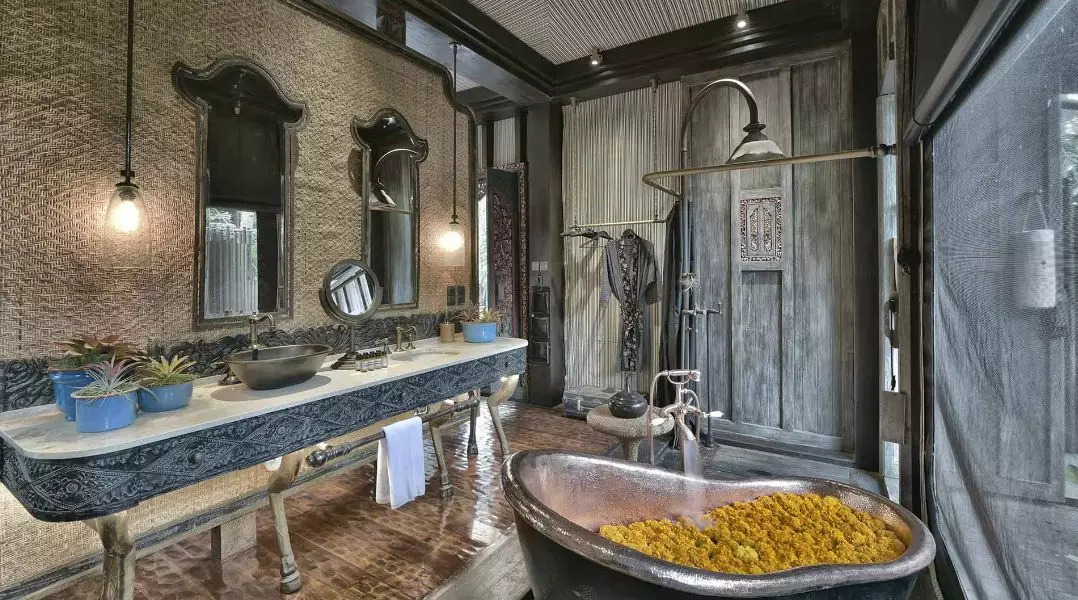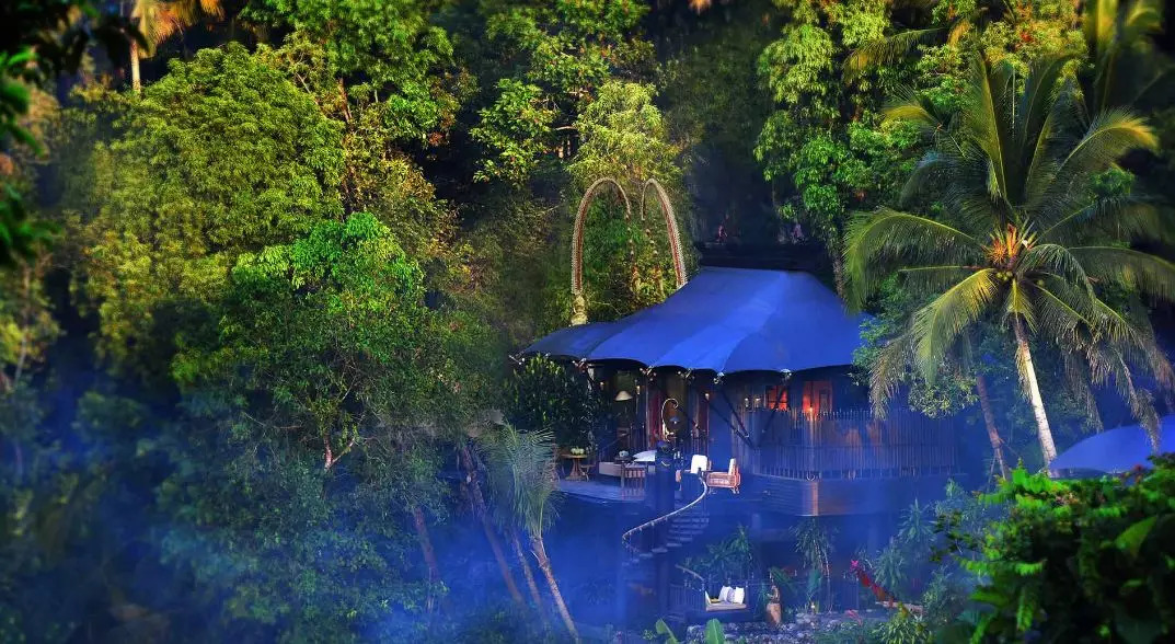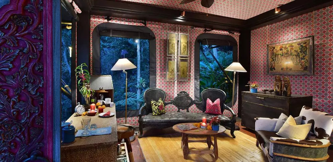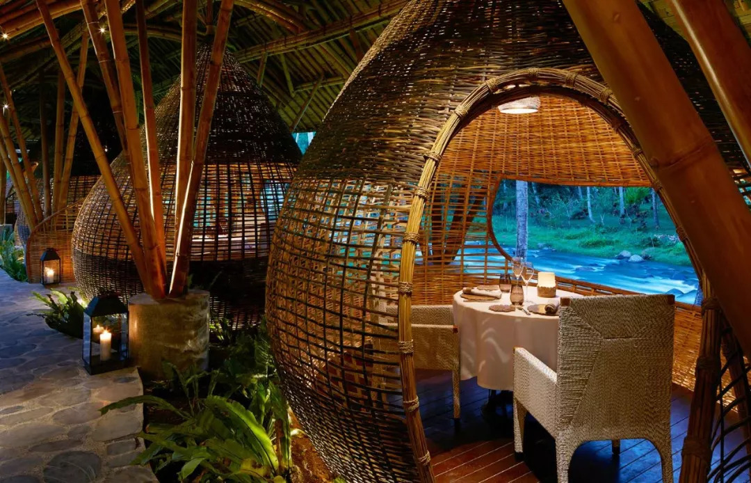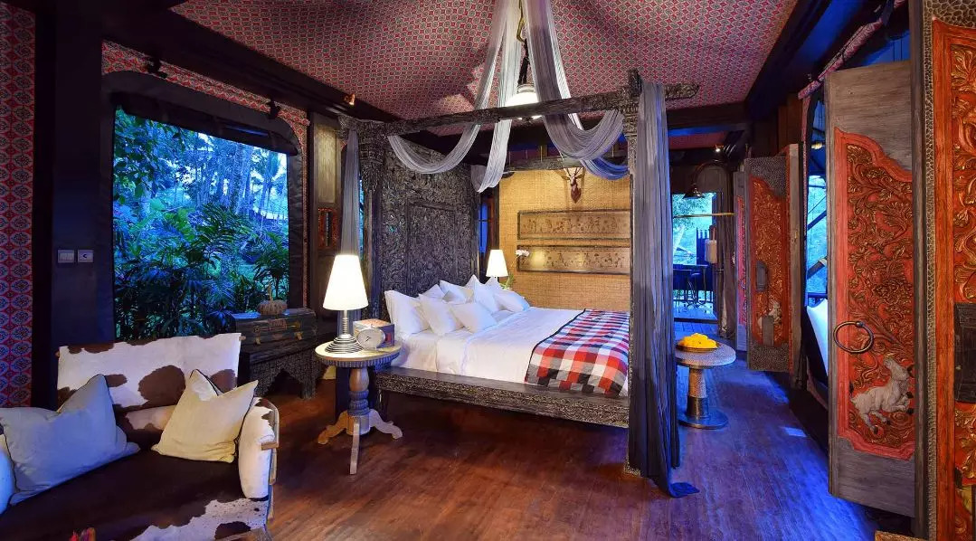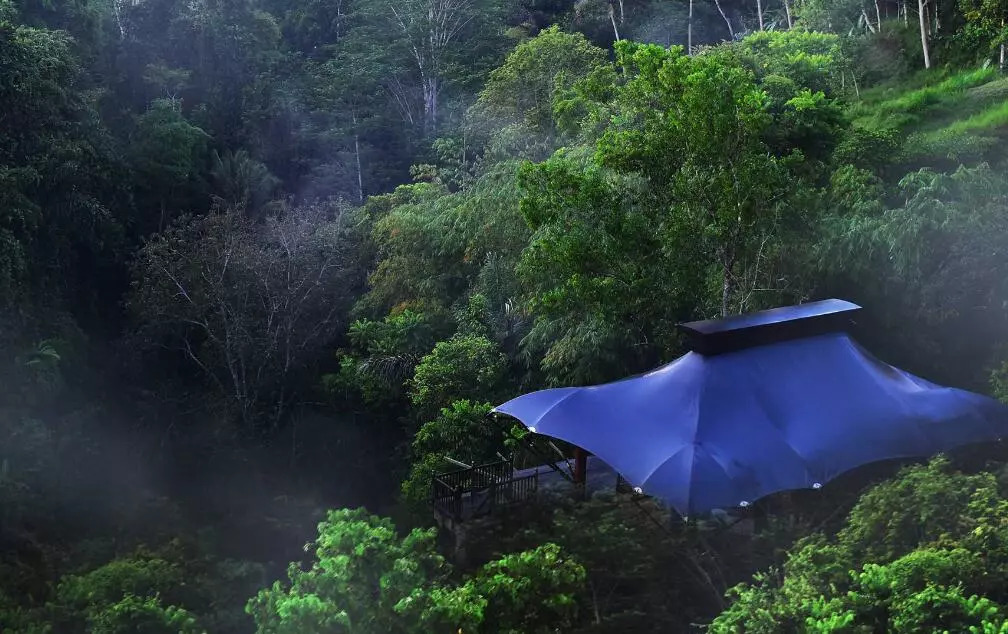 你需通过悬索桥抵达山谷斜坡上这些仿若在原始丛林自然生长的帐篷,其内部装饰追溯19世纪欧洲探险者对东亚文化的痴迷。