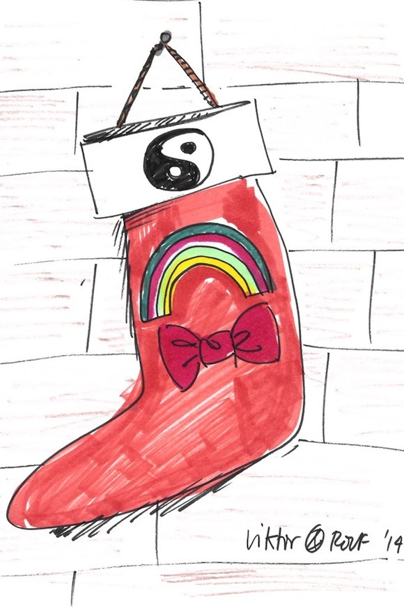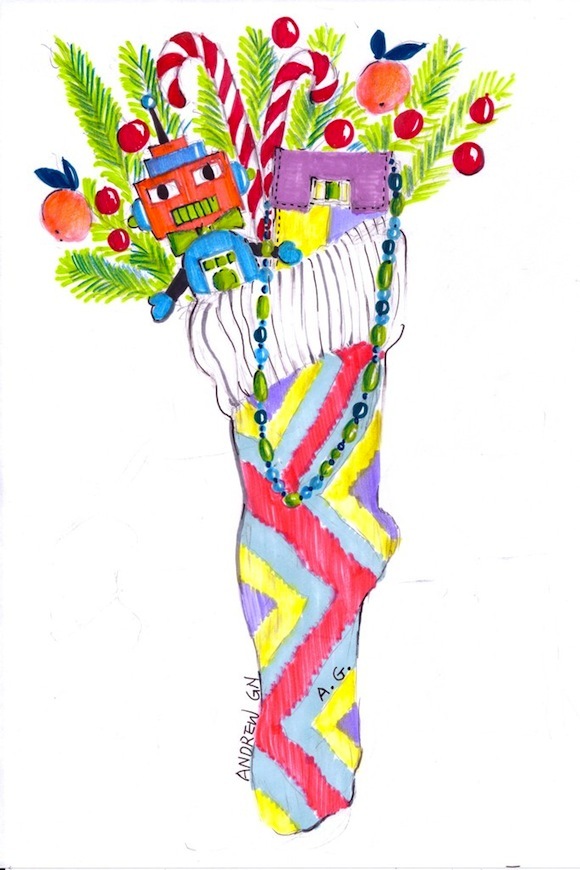 【1】“纱织的彩色圣诞袜里放上圣诞树枝和糖果,在袋口还得有珠宝做的机器人和昂贵的手袋。”—Andrew Gn ↓