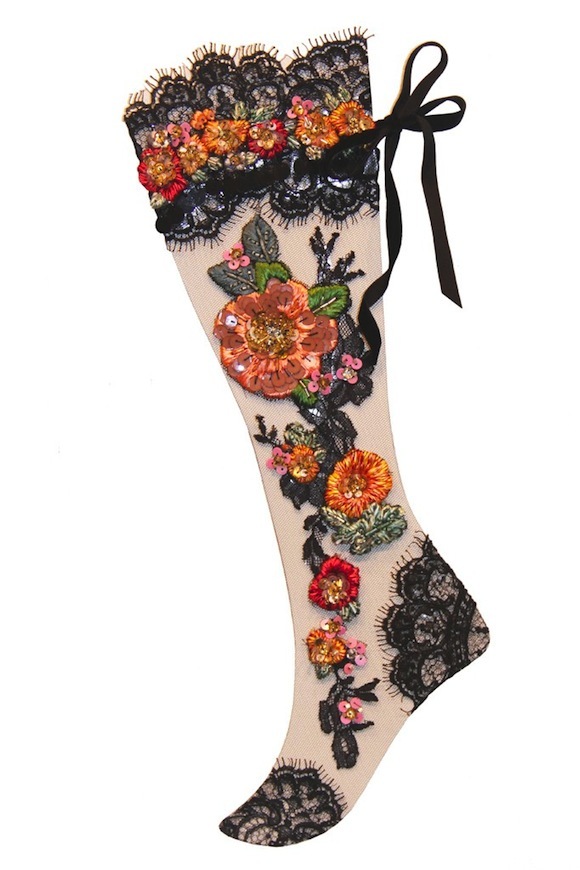 【14】“我的灵感来自Marchesa最新的2015春夏系列。我们用了一样的刺绣和细节处理,做了拼贴,让我们的长袜有一种现代吉普赛羊毛袜的感觉!”—Geogina Chapman和Keren Craig ↓