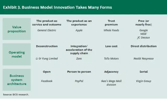 一旦企业对当前的选择有了深刻的认识,就可以进行头脑风暴式讨论,发掘新机会。为了让头脑风暴的练习更有动力,企业可以运用来自不同行业的成功创新模式,图三展示了三种商业模式:价值主张创新、运营模型创新和商业系统架构创新(这就是说,需要将创新与周围的商业网络相结合)。这个列表并没有完全穷尽所有模式,但是可以在思考新商业模式时带来灵感。