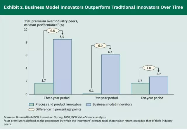 商业模式创新比产品或工艺创新更具挑战性,但是它也会带来极好的回报。我们和美国商业周刊最近进行了一个调查,目的是找到最有创新力的公司。我们通过分析这些创新者的数据,把它们分成了商业模式创新者和产品工艺创新者。我们的分析表明:两种创新都可以使公司获得高于行业平均水平的股东回报,但商业模式创新者的平均回报是产品工艺创新者的四倍以上。此外,商业模式创新带来的回报也更持续,即使在十年以后,商业模式创新者的表现依然比竞争者和产品工艺创新者优秀。(如图二所示)