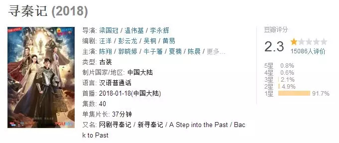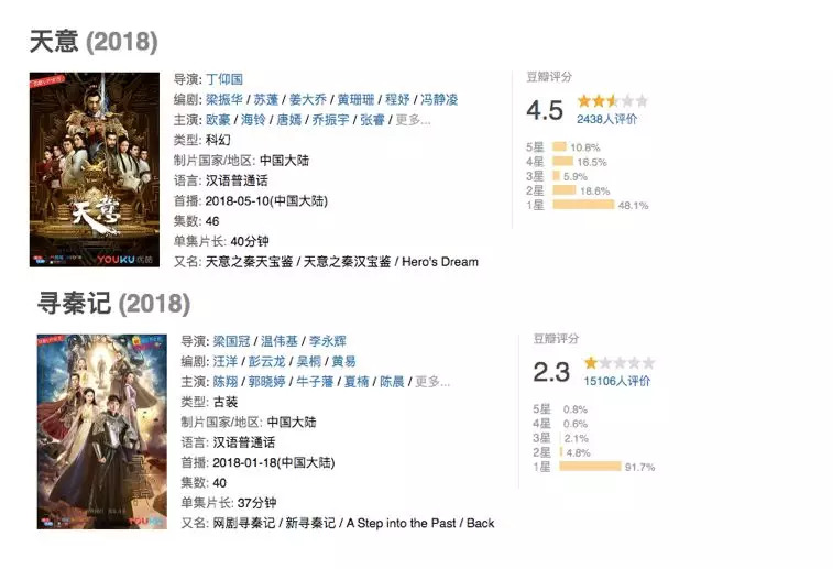 读娱君看到,《天意》和《寻秦记》两剧的豆瓣评分分别为4.5和2.3,后者剧集创2018上半年评分最低记录。至于播放量,《天意》由于还没播完暂且不论,而《寻秦记》除了2天破亿之后,也再无后续报道——要播放量没播放量,要口碑无口碑,可以说,这两部巨制彻底扑街了。