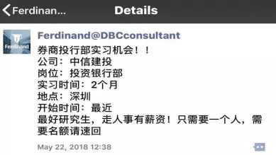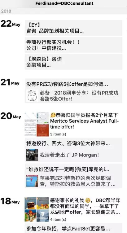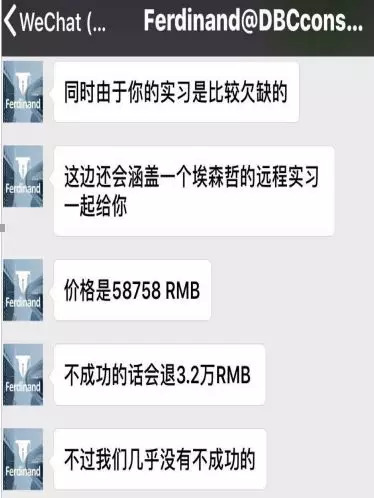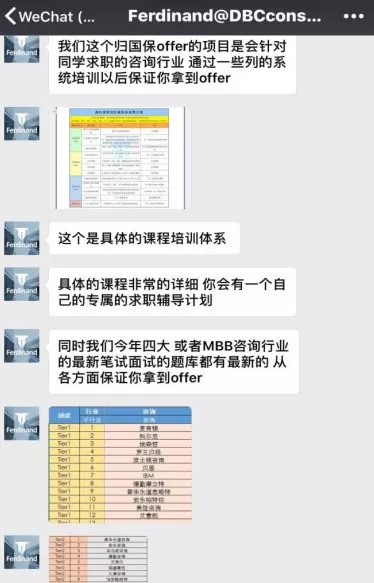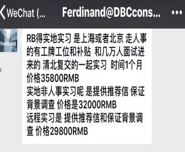 一位正在求职的金融专业应届毕业生就给记者举例,一个针对金融类海外留学生找金融相关工作的微信号Ferdinand@DBCconsultant就向学生保证,通过一系列培训后可以拿到一些公司的offer,费用高至五万多人民币。