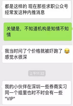 记者询问这种担保的实习机会是否确实有效,上述“应届金融学子”称,“我的小伙伴在深圳一些券商实习,同一个组里时不时会有一些VIP。”