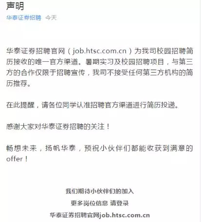 华泰证券方面表示,华泰证券招聘官网(job.htsc.com.cn)为我司校园招聘简历接收的唯一官方渠道。暑期实习及校园招聘项目,与第三方的合作仅限于招聘宣传,我司不接受任何第三方机构的简历推荐。在此提醒,请各位同学认准招聘官方渠道进行简历投递。