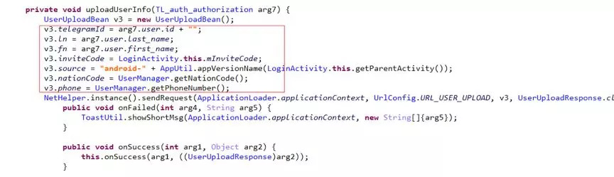 PeckShield研究人员发现币用在登录界面(LoginActivity)会将Telegram ID、显示名、手机号发送一个地址UrlConfig.URL_USER_UPLOAD。若继续跟查这个URL地址,会发现其最终上传服务器为https://www.biyong.info/app/user/upload,很明显这是币用的私有域名,并不受智能合约保护,而且上传数据前,系统并没有对数据体本身做安全处理。