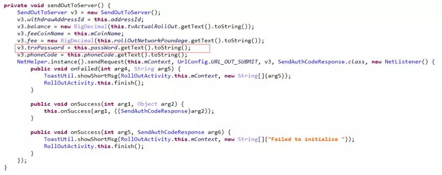 3、拥有许多诸如翻译、钱包、红包、邀请活动等超级功能。币用为了活跃用户群并快速导入流量,在各个群发送免费领币消息,引导用户创建钱包并参与抢发红包。众所周知,纯IM产品和涉及到资金管理的数字钱包产品安全标准是全然不同的。币用加入了创建钱包功能,并没有做好相应的资金安全保障。分析代码发现,当用户传输加密货币时,它会调用sendOutToServer()以明文形式收集并上传支付密码,而且密码规格是6位数字,倘若用户信用卡、支付宝、微信、邮箱等其他平台账户的密码和此密码一致,而且不幸手机里的某个APP被黑客拿到了ROOT权限,后果可想而知。