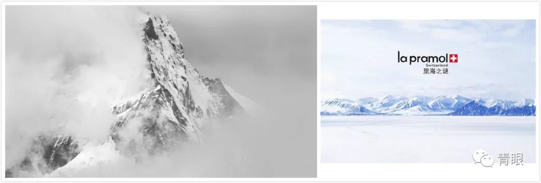 La Prairie的雪山照是羊羊羊在其品牌官网截的图,La pramol的雪山照也同样来自于官网,不同的是一个是雪山的局部,另一个是雪山山脉的全景,而相同的是,它们都是瑞士的代表,也是二者标榜其品牌产地的重要元素。