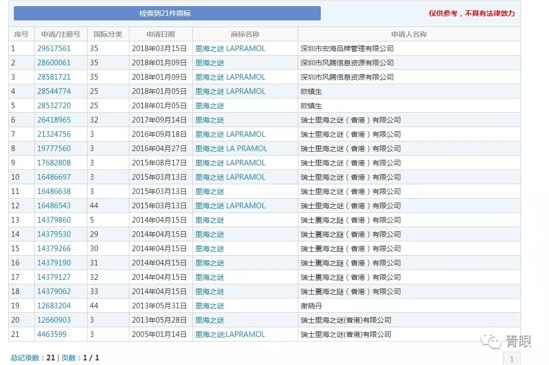 另一方面,瑞士工商注册系统中并无任何与La pramol有关的信息,羊羊羊通过中华人民共和国国家工商行政管理总局商标查询系统查询得知,“里海之谜LAPRAMOR”商标注册时间最早仅可追溯到2005年,商标所有权属于瑞士里海之谜(香港)有限公司。而天眼查显示,该公司注册时间为2013年5月。
