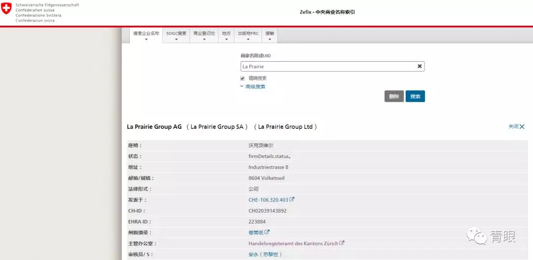 瑞士工商注册系统虽只显示了上述两家瑞士公司自2013年7月5日起在SHAB商业登记处发布的消息,但通过查询用户身份证明(UID)显示,二者从1968年开始在瑞士开具增值税发票,这也从侧面证实了La Prairie品牌的成立时间。