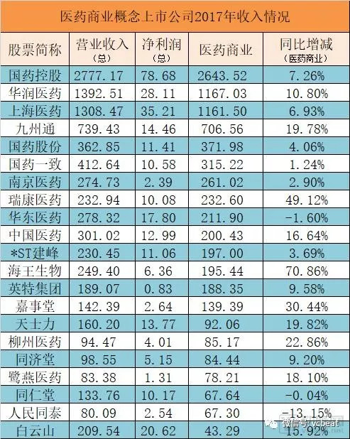 以下是医药商业板块上市公司2017年收入及净利润情况,同时列出了其医药商业业务营收的增速: