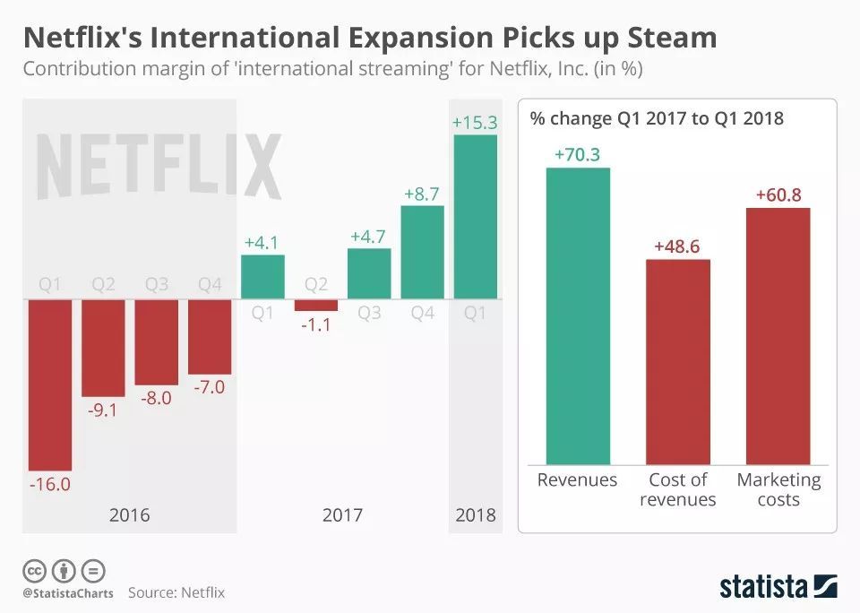 同比2017Q1,2018Q1Netflix在利润上增长了70.3%,接近整整一倍