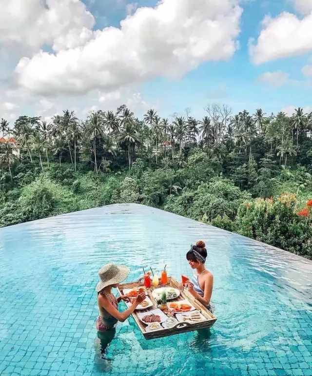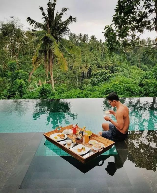 这家网红酒店的漂浮早餐在ins上也刷屏了很久,这里的欧美游客相对而言更多一点。和之前的包围式泳池不同,Kamandalu 的私人泳池风光赞爆了,望出去就是无边的丛林,泡在这样的环境里吃饭真的是太爽了!漂浮早餐的价格大概加70元左右一人。