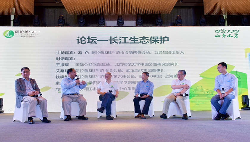 在由冯仑主持的“长江生态保护”的主题论坛环节,阿拉善SEE第六任会长钱晓华、现任会长艾路明,与国际公益学院院长、北京师范大学中国公益研究院院长王振耀、重庆大学资源及环境科学学院袁兴中教授、重庆两江之源服务中心的负责人向春分别结合自身的环保历程展开对话。