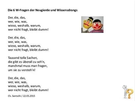 德国人非常拘泥形式,不擅长幽默。他们一板一眼、正襟危坐,做事谨慎小心。计划狂、偏执狂,凡事都要刨根问底!德国有个儿童节目,片头曲就是:Wieso? Weshalb? Warum? Wer nicht fragt, bleibt dumm(为什么?为什么?为什么?谁不问,谁就傻)……