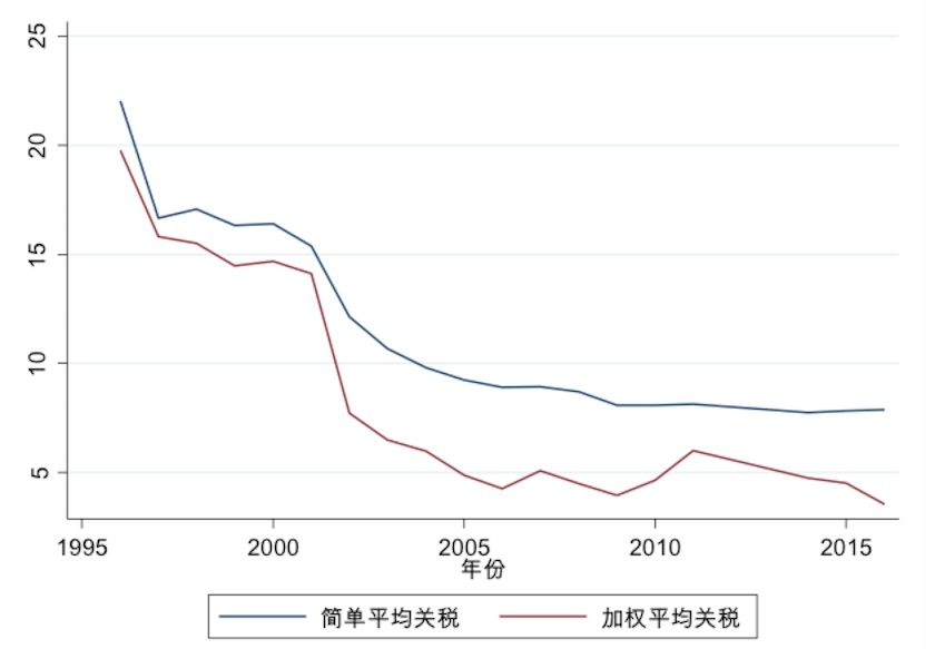 说到进口的阻碍因素,许多人的第一反应是中国关税太高。而事实上,中国目前的关税总体水平并不高。图1展示了中国1995年到2016年的总体关税水平。1995年以来,中国经历了大规模的关税削减,平均关税由1995年的22%下降到2016年的7.9%。如果以进口额为权重计算加权平均关税,则2016年平均关税只有3.5%。
