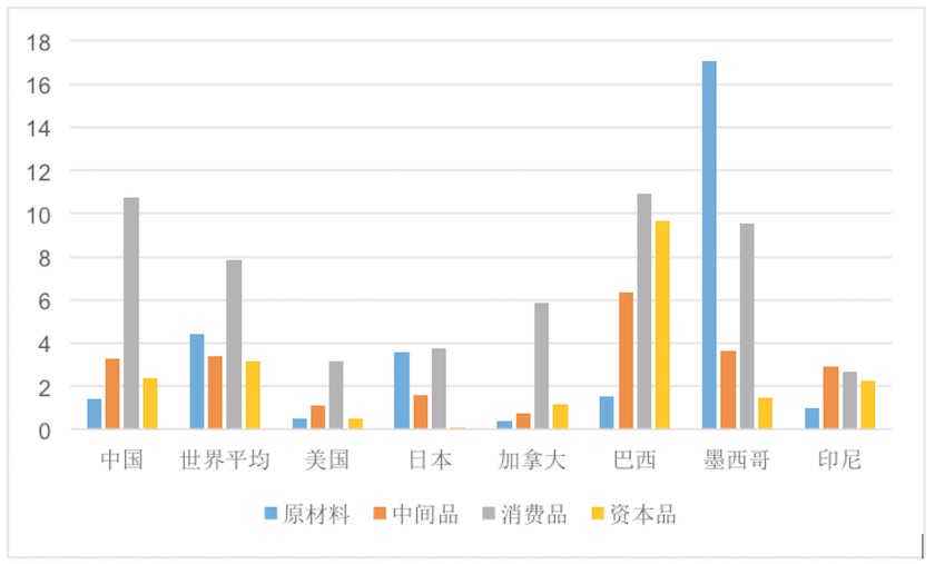 既然总体关税水平并不高,那么为什么日常生活中我们经常觉得进口货比国外贵很多呢?这是因为我们平常接触到的商品多为消费品,而中国在消费品方面仍存在一定的关税保护。图3展示了不同商品类型的关税水平。商品被分为四类:资本品(如大型机器设备)、消费品(如家电、食品)、中间品(如齿轮、汽车部件),以及原材料(如橡胶、石油)。可以看到虽然不同类型商品都经历了大幅度的关税削减,但是消费品的关税下降幅度总体低于其他类型的商品。2016年,资本品、中间品以及原材料的关税已经降到2.4%、3.3%与1.4%,而消费品的关税还保持在11%。当然,从世界范围来看,消费品关税比其他商品高是一个普遍现象(图4),反映了全球贸易政策重商主义的倾向。但是11%的关税水平仍存在较大的下降空间。事实上,同为发展中国家的印尼消费品关税已不足3%。
