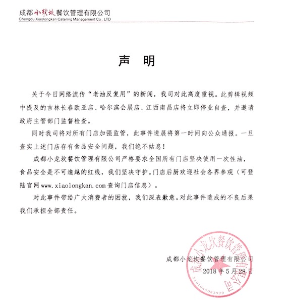 这条视频在28日晚间登上了微博热搜榜。当晚22点36分,小龙坎通过微博、官方网站发布了声明,称“此剪辑视频中提及的长春欧亚店、哈尔滨会展店、江西南昌店将立即停业自查,并邀请政府主管部门监督检查”。