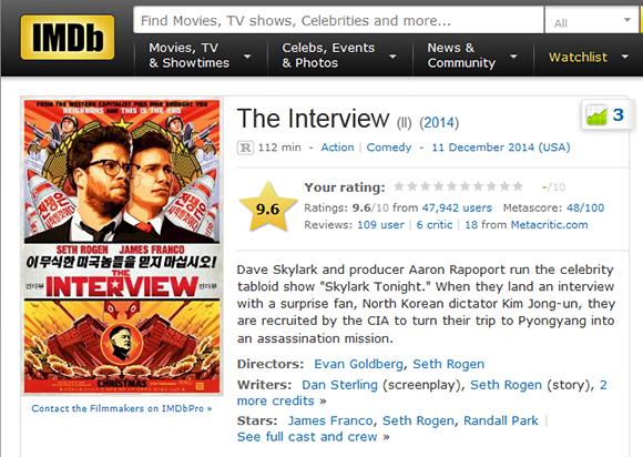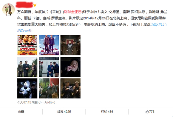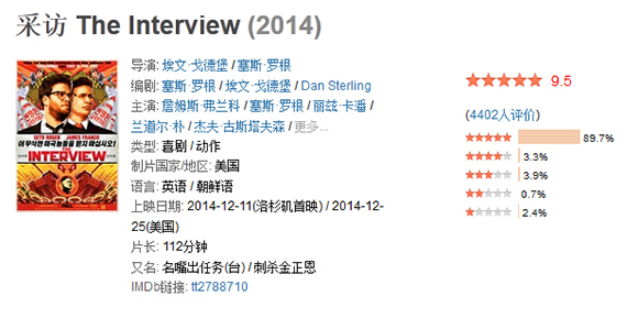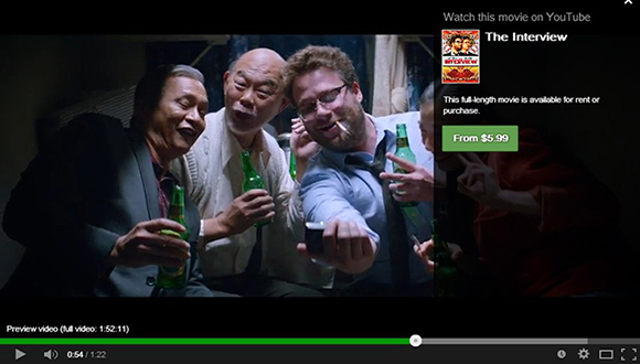 《刺杀金正恩》可谓千呼万唤始出来!美国西部时间12月25日,索尼影业声称,已有多个网络平台可以提供资源——包括YouTube、Google Play、微软Xbox以及索尼专用的网页www.seetheinterview.com,上午10点,那些曾在烂番茄网上表达“想看”的人,就可以花 5.99美元的租金,或者干脆花14.99美元买个高清视频来一饱眼福。