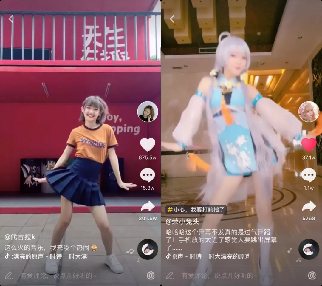 目前火遍抖音的“摆裙舞”,是一段配合西语歌曲《Mi Gente》音乐节奏,深受“抖友”们喜爱的可爱舞蹈。而这段舞蹈的二次元版,其实就是小姐姐们换上了COS服再重新演绎。比如抖音舞蹈红人@代古拉k 和知名动漫博主@荣小兔头 跳的摆裙舞,除了服装方面的差异外,整段舞蹈的大框架基本上都是一模一样的。