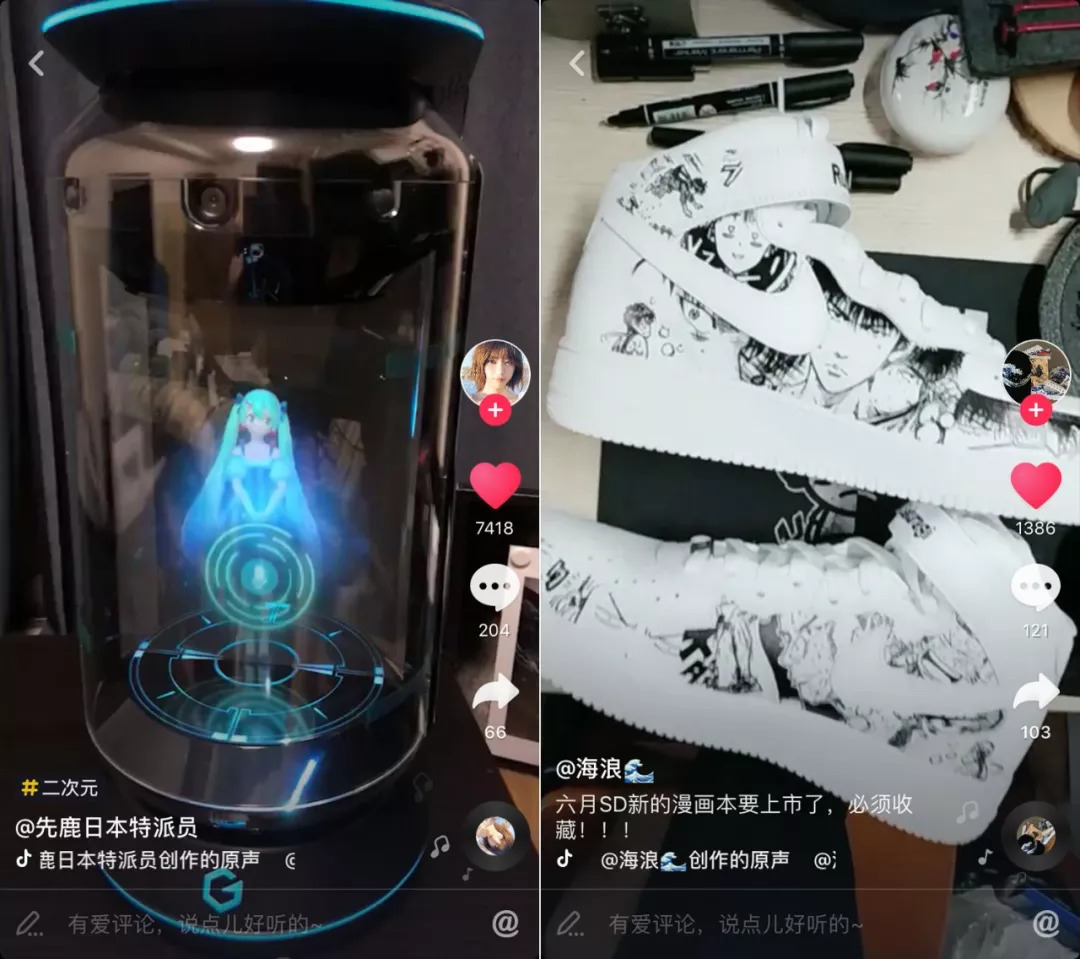 至于抖音中的“技术流”短视频,也同样有对应的二次元版本。比如@先鹿日本特派员 就上传了一段初音未来全息投影设备的短视频,@海浪 则通过手工绘制,制作了一双“限量版”Nike AF1。