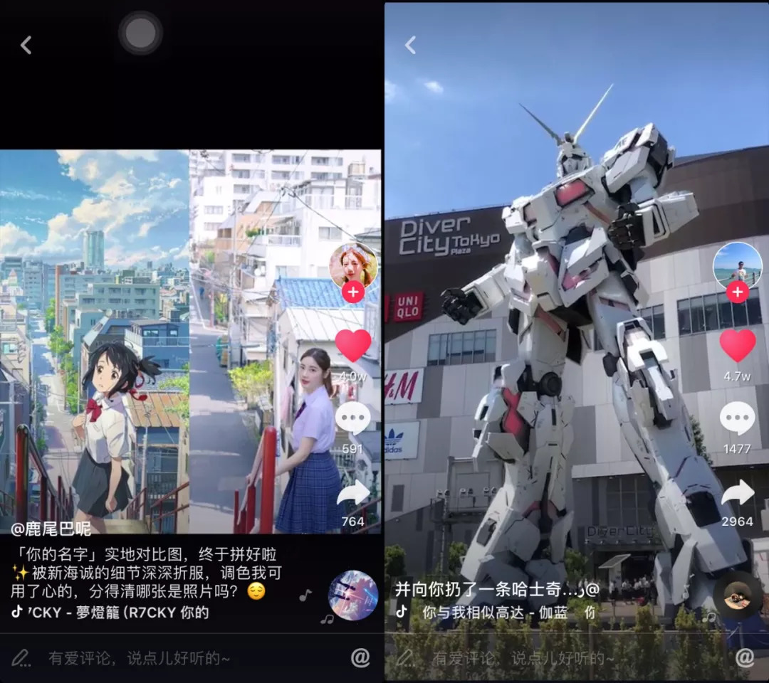 此外,像《你的名字。》取景地、东京台场1:1独角兽高达等一系列二次元“圣地巡礼”,也是不少二次元爱好者经常在抖音里上传的旅游类短视频。