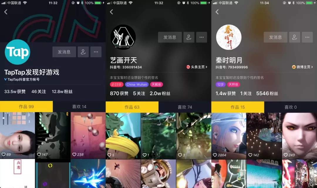 硬广流。简单来说,这就是把已经做好的动画、游戏视频、活动现场等内容直接上传到抖音,比如每一部短视频都如同抖音信息流广告一样的@TAPTAP发现好游戏 ,无脑播自家动画剪辑且不针对手机屏幕进行内容优化适配的@艺画开天 ,以及只把抖音当作漫展活动和动画剪辑发布渠道的@秦时明月 。
