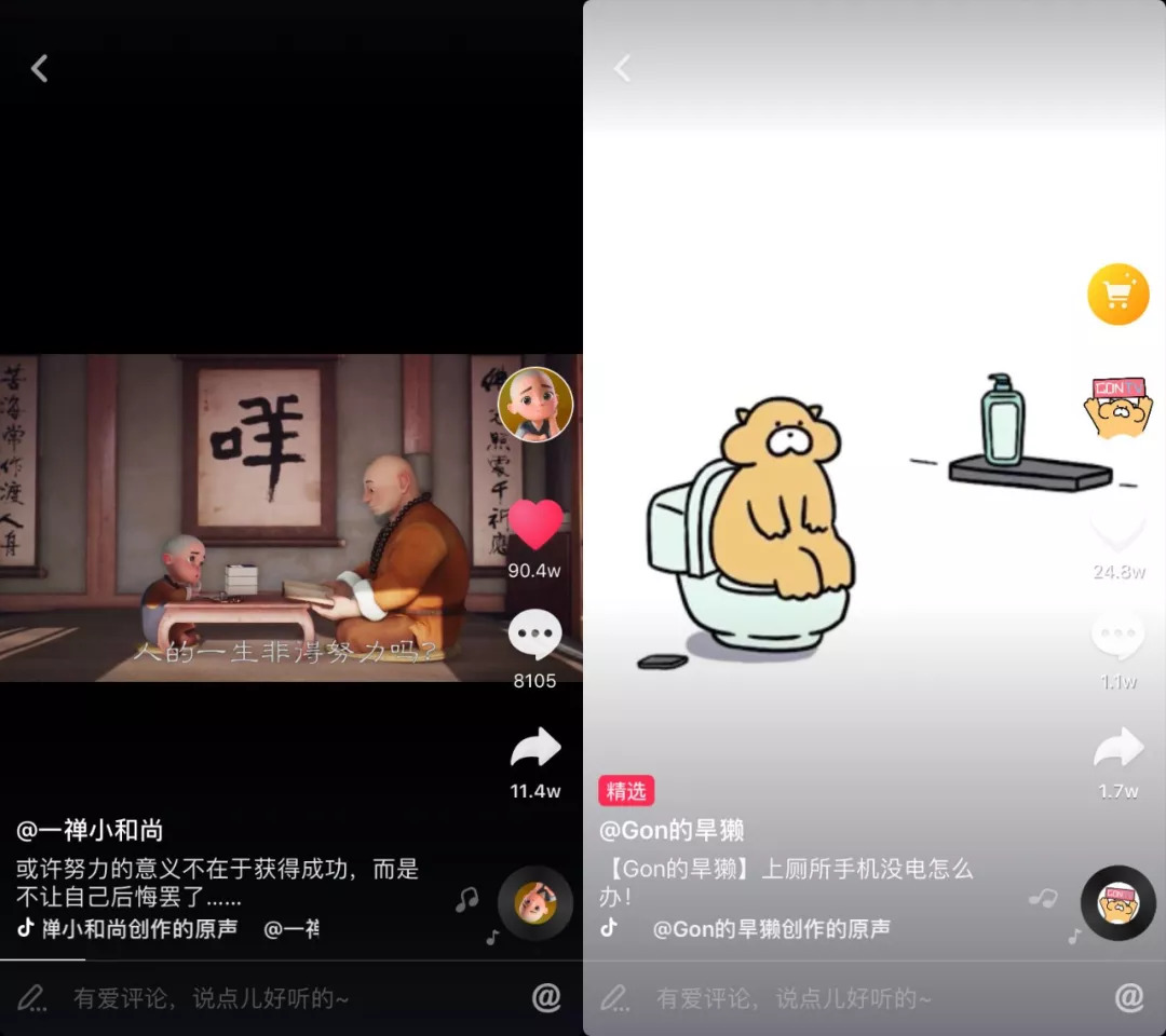 种族优势流。在这些官方账号中,存在一些本来就是基于短视频打造的动漫类IP产品,如@一禅小和尚 、@Gon的旱獭 ,它们此前已经在微博、今日头条等平台积累了不少短视频营销经验,所以在抖音平台上多少都有一些“种族优势”。