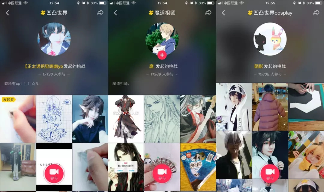 中国二次元相关IP方面,目前ACGx找到参加人数过万的,是#凹凸世界 (1.6万)、#魔道祖师 (1.1万)、#凹凸世界cosplay (1.1万)这三个抖音挑战,其短视频内容几乎都是来源于粉丝们的二次创作。这可能是由于这两个IP在目前有着相对繁荣的同人创作氛围,其粉丝群同时也与抖音用户高度重合所致。