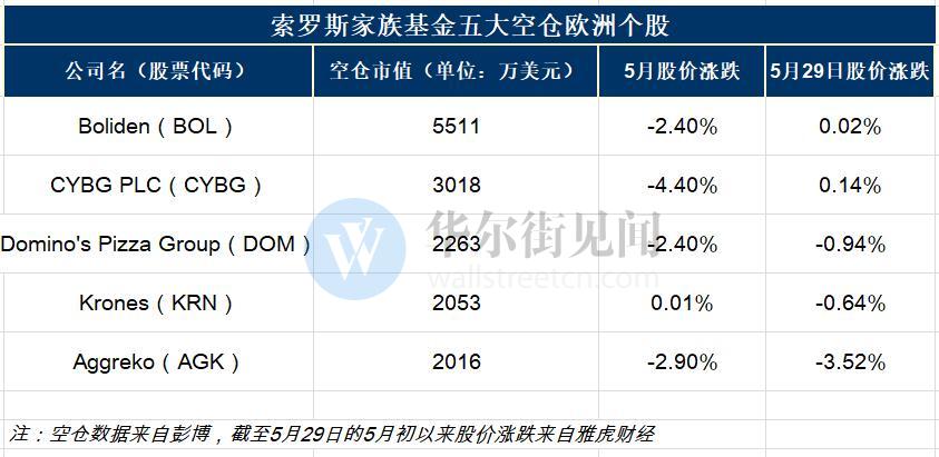 索罗斯警告欧洲面临危机的当天、5月29日本周二,Boliden和CYBG股价分别收涨0.02%和0.14%,Domino’s Pizza、Aggreko和Krones股价分别收跌0.94%、3.52%和0.64%。