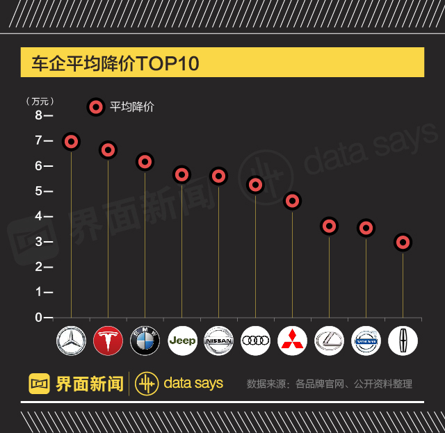 从平均降价来看,力度最大的车企是奔驰,平均降价6.97万元。