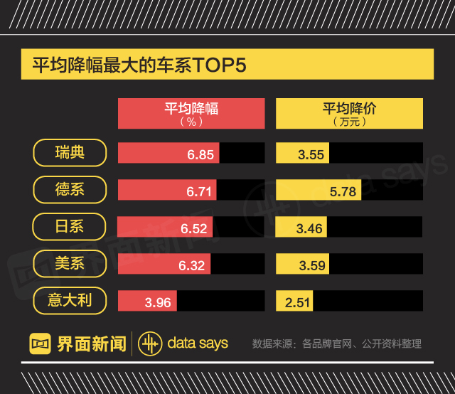 按车系来看,此次降价潮中最实在的是来自瑞典的沃尔沃,平均降幅在6.85%。第二名的德系车平均降价最高,为5.78万元。