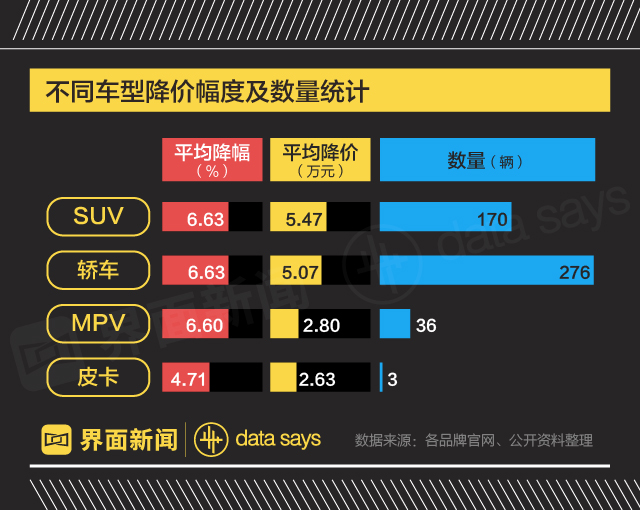 分车型来看,SUV和轿车的平均降幅旗鼓相当,均为6.63%。