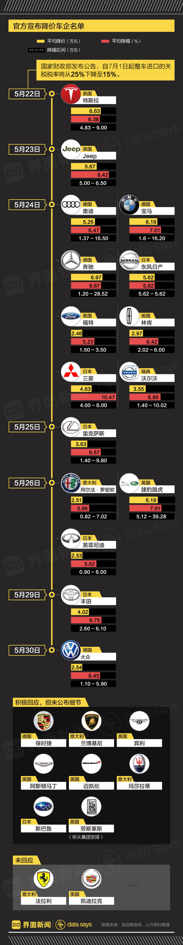 2018年5月22日国家财政部发布公告,自7月1日起整车进口的关税税率将从25%下降至15%。关税下调政策发布不到三小时,特斯拉宣布调整在中国大陆在售车型价格。随后,各大有进口车业务的车企纷纷宣布价格调整方案。据界面新闻记者不完全统计,截至5月30日,共有24家车企积极回应,其中16家给出明确降价细则。