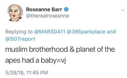 罗斯安·巴尔(Roseanne Barr)是热播剧《罗斯安家庭生活》(Roseanne)的女主角,引起轩然大波的是她在周一发出的一条推特,她在推特中写道:“穆斯林兄弟会和人猿星球,生出来的宝宝=vj。”